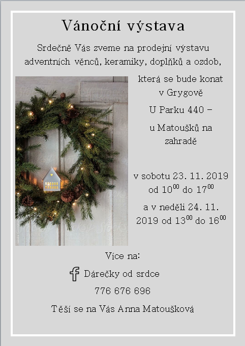 Srdečně Vás zveme na prodejní výstavu adventních věnců, keramiky, doplňků a ozdob, která se bude konat v Grygově U Parku 440 – u Matoušků na zahradě v sobotu 23. 11. 2019 od 1000 do 1700 a v neděli 24. 11. 2019 od 1300 do 1600 Více na: Dárečky od srdce 776 676 696 Těší se na Vás Anna Matoušková |
